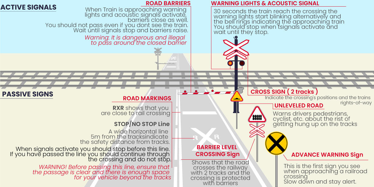 Railway signs and warning devices have been installed along roads and at railway crossings to warn drivers and command traffic. They save lives, so you need to know what they show and warn.
